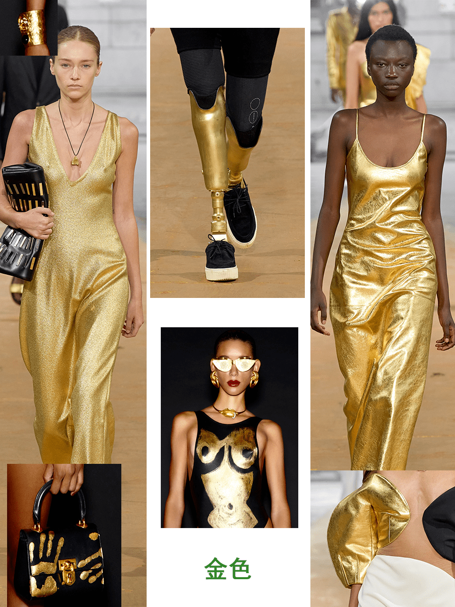 金属的颜色在金色、银色、铜色等不同色彩之间的搭配中,也有光滑的面料,以丰富光泽感也多了一些高贵典雅的奢华华丽气质。