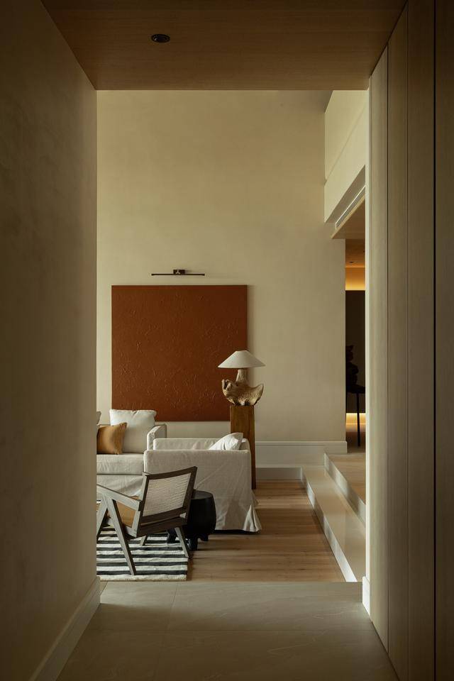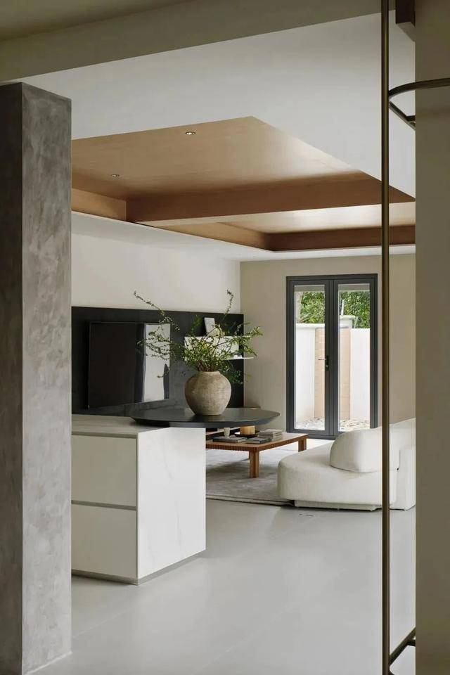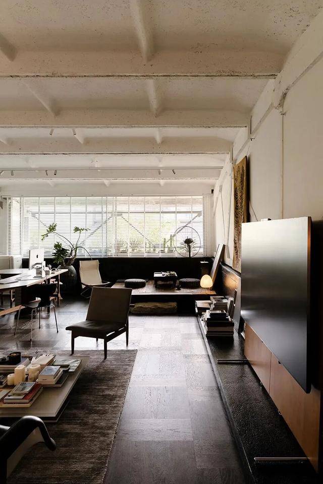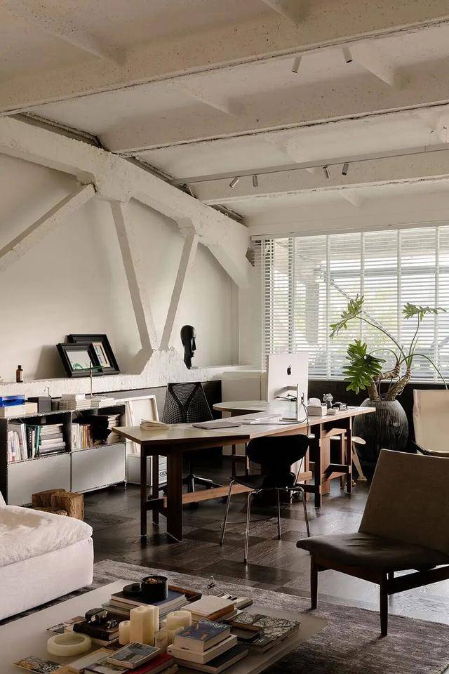 穿过一道近乎隐形的门,便进入潘天云终于拥有的独立办公室。空间浸润着度假酒店般的侘寂与松弛感,的混凝土梁架揭示出他对粗野主义结构的偏爱,真实的木料与经典的库卡波罗椅子则增添了时间的温度。