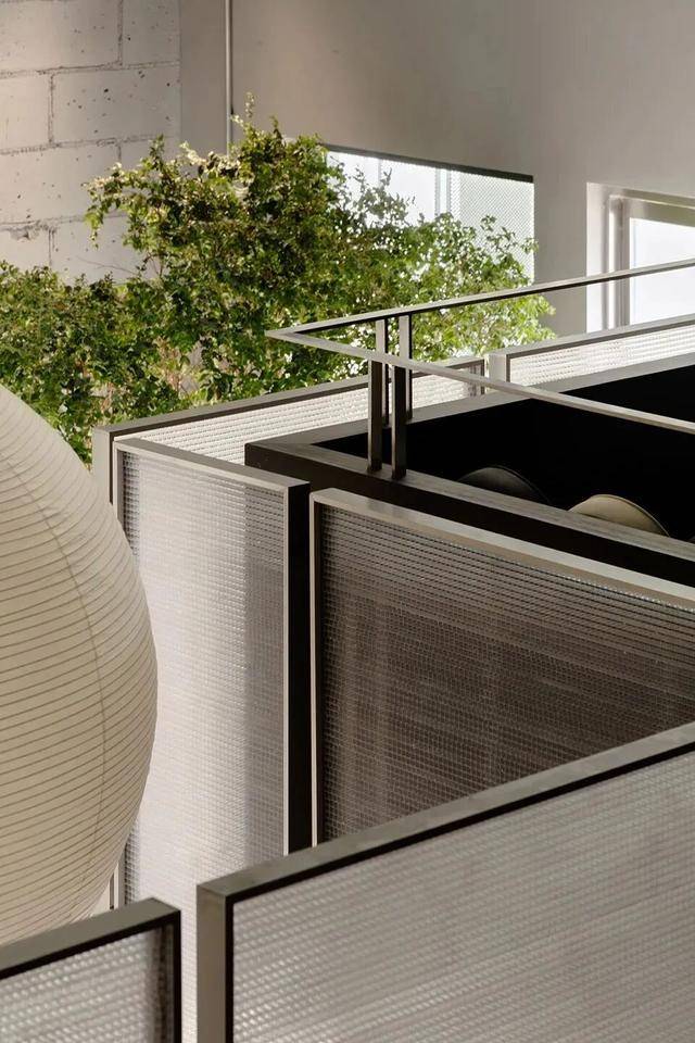 这种布局打破了常规思路“一楼纯接待、办公隐于后”的传统逻辑,将日常工作的场景推向空间的前台。材料的选择也颇具巧思,常见的农业大棚用板材,经过横向重组后,远看通透,近观朦胧,仿佛隐喻着设计创意与现实落地之间那种既开放又保留的张力。