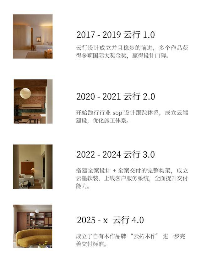 未来,云行希望成为这样一个品牌: 以平台化聚合专业力量,以系统化保障落地品质,在规模扩张中不失温度,在价值坚守中不失张力,一个能让客户“闭眼选择”的设计品牌。